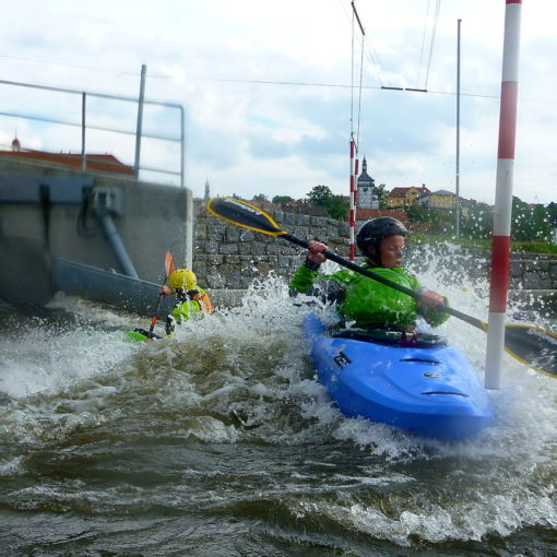Start sprintu na levém břehu kousek nad „Kobylí hlavou“ byl psychologický, technický i fyzicky náročný oříšek, protože bylo nutné dostat se hned po startu přes silný peřejnatý proud k protějšímu břehu a chytit tak správnou „lajnu“. V opačném případě by to bylo velké skákání po balvanech a padání do vodních válců a to nikdo nechce :-D. Rozhodla jsem se sprint jet na své tréninkové lodi, která je sice bytelná, ale trošku do ní teče. Uvážila jsem, že na krátké sjezdové trati vody do lodi zas tak moc nenateče. Jenže před mým startem udělal pořadatel 8 min. pauzu a s tím jsem fakt nepočítala. Vylézat a vylévat loď nebylo možné, takže když mě konečně na startu odmávli, měla jsem v lodi již vody docela dost. S vodou v lodi se fakt nedobře manévruje, a tak se mi nedařilo jet úplně optimální stopu a trochu jsem se s tím prala. S lehce neovladatelnou lodí jsem dokonce vlítla do obrovského válce na „Železňáku“ bokem. Zde mi však voda v lodi paradoxně pomohla, protože loď byla tak těžká, že mě válec hned pustil 😀