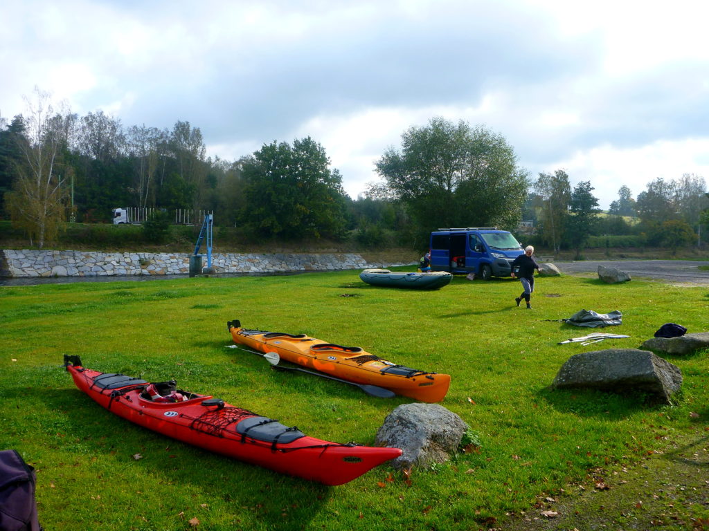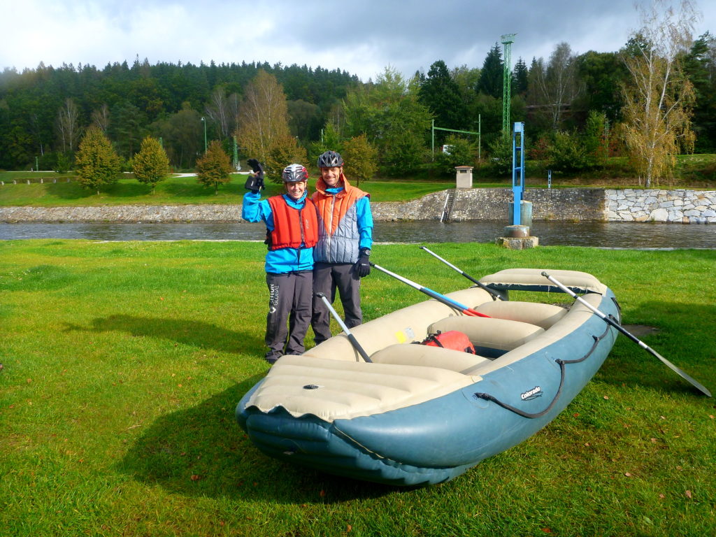 Plánujeme, že 3 naše seakajaky pojedou celou trasu až do Krumlova, zatímco raft pojede jen úseky Vyšší Brod – Rožmberk a Pískárna – Krumlov. Dáša s Kuncovkou na K2sea hrábnou na startu do vody a mizí. Potkáme se s nimi až v Krumlově.