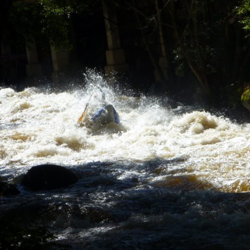 Řeka korytem přímo letí. Tam, kde při normálním průtoku bývají kameny či stupně, jsou nyní jen táhlé vlny. Na prvních kilometrech mě překvapuje jejich nekompromisní síla. Vodní víry s lodí cloumají ze strany na stranu, chvíli mi trvá, než se v nich dokážu uvolnit a neprat se s nimi. Řeka se mnou upaluje, i na klidných úsecích mi sporttester ukazuje rychlost 18 km/h.