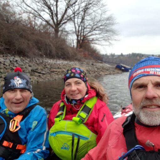 - dopoledne přijíždíme do přístavu Barhöft. Auto zde po dohodě se správcem přístavu ponecháváme zaparkované, nabalíme kajaky nezbytným proviantem a vyrážíme na sever k ostrovu Hiddensee. Fouká silný vítr kolem 30 km/s. Zkoušíme jet pádlovat podél západního pobřeží ostrova. Hladina pěkně vlní, ale jízda proti větru je pomalá a vysilující. Vracíme se tedy zpět na jižní cíp Hiddensee a jedeme k severu v závětří podél východního břehu. Je tu ukrutná mělčina, ale voda je rovná. Začíná pršet, vítr sílí, mělčiny máme dost, stáčíme se tedy po větru na severovýchod do průlivu mezi Hiddensee a Rujánou. Záhy opouštíme mělké vody, s hloubkou a sílícím větrem se začínají zvedat zajímavé vlny. Prší, viditelnost pár desítek metrů, jedeme po vlnách jen podle navigace. Někde před námi by se měl dřív nebo později ukázat protější břeh u Schaprode. Je to parádní jízda po vlnách, surfujeme, naprosto dokonalý „downwind“. Pobřeží u Schaprode je atakováno silným větrem a vlnobitím, přesto zde na chvíli přistáváme na svačinu a na operativní poradu. Měníme původní program, Arconu si necháme na jindy, jet tam v tomto počasí by bylo nebezpečně a také hodně fyzicky i časově hodně náročné – neboť zpět k autu bychom se pak museli vracet nějakých 30 km proti silnému větru a vlnám. Dle nového plánu přejíždíme do relativního závětří jihovýchodního pobřeží ostrova Ummanz, kde nacházíme vhodné místo na přenocování. Dnes to bylo 28 km na vodě. Večeře chutná. leča dost 🙂