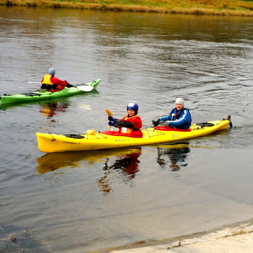 Pod hrází dobíhám Sebastiana a Holgera, jedoucí na dvoukajaku Nello WaterMan. Nějakou dobu pak po řece jedeme spolu. Jsou to milí kluci, před nájezdem do peřejek mi galantně dávají přednost, před přeběhy také. V druhé půlce trati kluky nechávám za sebou, přeběhy je příliš zpomalují.