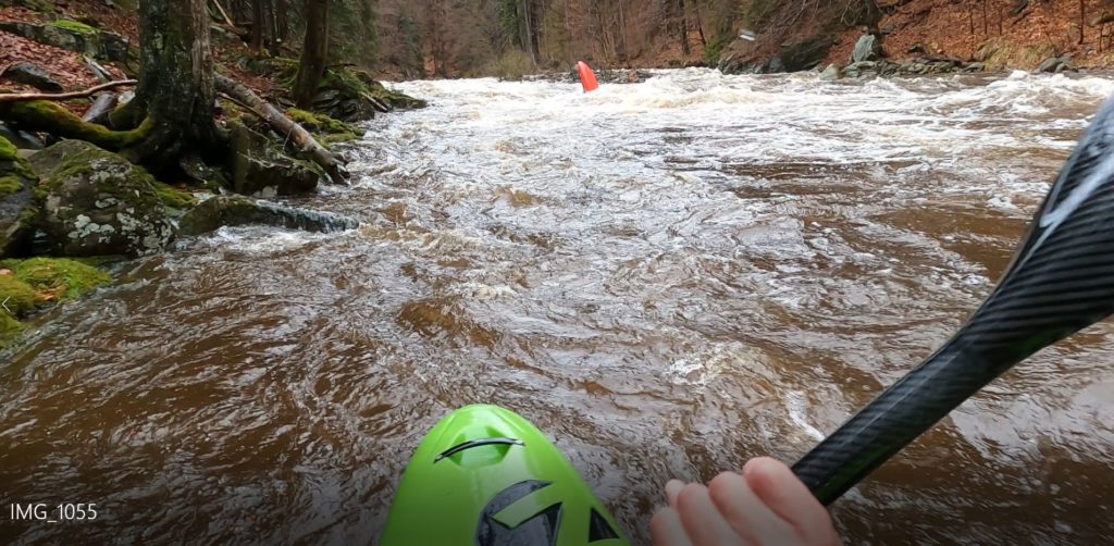 Jizera je již také značně nakrmená s většími vlnami a o hodně širší než Mumlava. Před „Ostrovem hrůzy“ zastavujeme vlevo a jdu se podívat, co nás čeká. Tomášovi se napřed moc nechtělo ( se kouknout ), ale bylo dobré vidět, že poslední válec u ostrova je nutné najet úplně vpravo po jazyku, protože za tímto válcem voda valí do nějakých naplavených zaklíněných stromů, plných olámaných větví. A s tím nikdo z nás nechtěl mít co dočinění. Jedeme to tedy zcela dle našich předpokladů, vlny velké a fofr dolů.