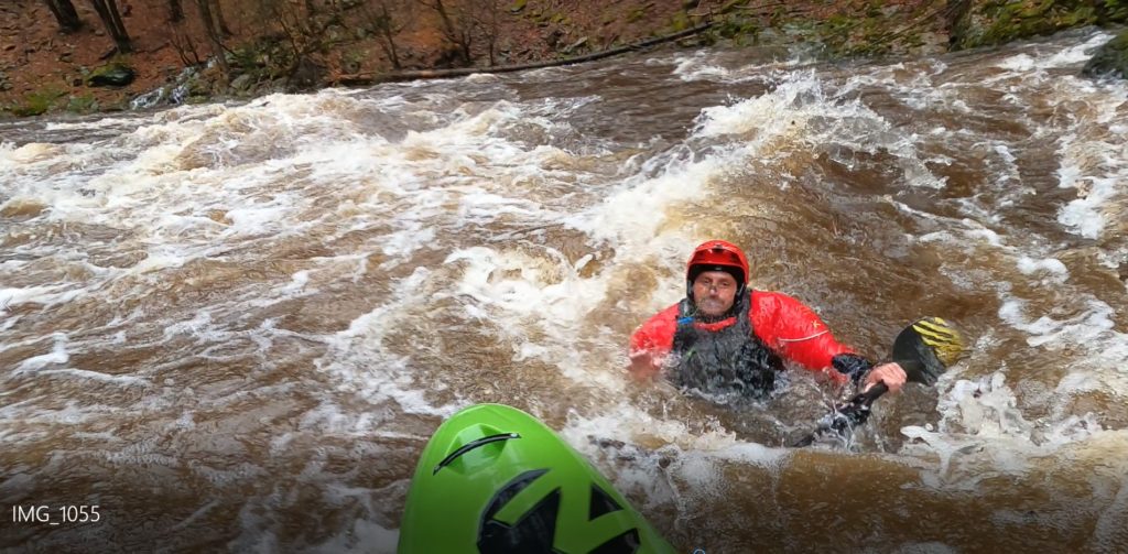 Říkám si, to už docela jde. A to je vždycky chyba, když člověk začne takto přemýšlet a je málo ostražitý. Na tyto myšlenky má přijít až v cíli. Místo cíle přišla pěkná díra s válcem a ta si mě krásně přitáhla zpátky – válec dílo dokonal. Když mě vyplivnul, tak jsem již byl na půl z lodi venku. Nebyl tak veliký morál nechat se chvíli motat válcem. I když mi Tomáš fandil, abych to zvednul, bylo pozdě, začala předfinálová rozplavba. Jizera je za tohoto stavu opravdu rychlá a vylézt z řeky je docela problém, pro nízkou absenci vracáků poblíž břehů. Dal jsem cca 200 m v pohodě pod 2 minuty. Tomáš mi zachránil lodičku zachycenou, naštěstí o další ostrůvek.
